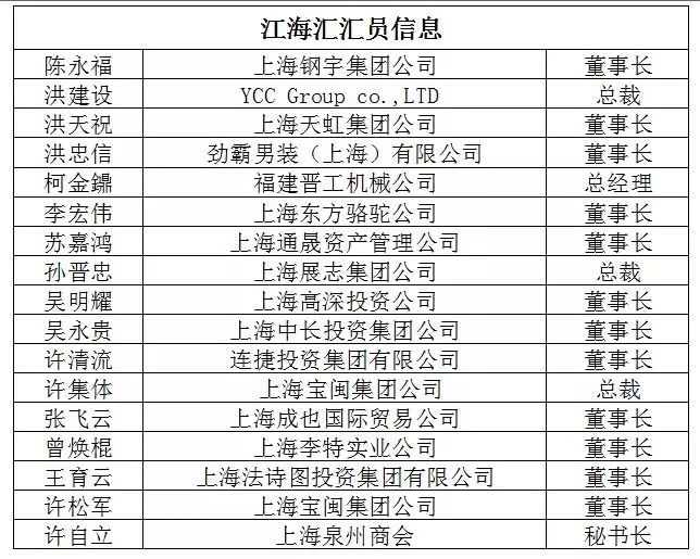 江海彙:“江海彙”由二十餘位晉江籍全球企業家低調發起籌備近兩年時間,於2015年7月18日在上海正式舉行隆重的籌備會,正式宣告這一新生的閩商組織創立啟動。以“江海彙,彙江海”為主旨的“江海彙”,有you著zhe相xiang同tong地di緣yuan身shen份fen和he文wen化hua根gen基ji並bing在zai各ge自zi產chan業ye領ling域yu獲huo得de成cheng功gong的de閩min商shang領ling袖xiu們men,希xi望wang通tong過guo切qie實shi深shen入ru的de溝gou通tong分fen享xiang,搭da建jian起qi一yi個ge能neng夠gou對dui閩min籍ji企qi業ye家jia產chan生sheng向xiang心xin力li的de社she交jiao聚ju合he平ping台tai,建jian樹shu並bing弘hong揚yang全quan新xin閩min商shang精jing神shen與yu商shang業ye文wen明ming的de會hui員yuan型xing組zu織zhi。“江海彙”提出了“成為全球閩商組織的楷模”的願景和“助力彙員成就偉業,成為彙員精神家園”的使命,提出了“挑戰、成長、信任、關懷”的價值觀,明確了“企業發展、家族治理、商業合作”三位一體的組織定位,並一致通過將“善觀時變,順勢有為;敢冒風險,愛拚會贏;合群團結,豪俠仗義;合群團結,豪俠仗義”的閩商精神,作為“江海彙”秉持的組織宗旨和行動指引。