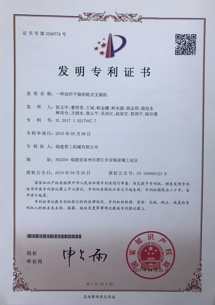 2019年,晉工一種動作平穩的輪式叉裝機(以下簡稱晉工叉裝機)正式獲得由知識產權局頒發的《發明專利證書》。發(fa)明(ming)專(zhuan)利(li)證(zheng)書(shu)的(de)取(qu)得(de),既(ji)是(shi)對(dui)晉(jin)工(gong)叉(cha)裝(zhuang)機(ji)品(pin)質(zhi)的(de)認(ren)可(ke),同(tong)時(shi)也(ye)有(you)利(li)於(yu)進(jin)一(yi)步(bu)完(wan)善(shan)公(gong)司(si)知(zhi)識(shi)產(chan)權(quan)保(bao)護(hu)體(ti)係(xi),發(fa)揮(hui)公(gong)司(si)自(zi)主(zhu)知(zhi)識(shi)產(chan)權(quan)優(you)勢(shi),促(cu)進(jin)技(ji)術(shu)創(chuang)新(xin),增(zeng)強(qiang)公(gong)司(si)的(de)核(he)心(xin)競(jing)爭(zheng)力(li)。