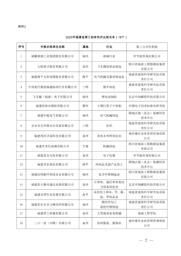 為貫徹落實工業和信息化部《工業綠色發展規劃(2016-2020)》《綠色製造工程實施指南(2016-2020年)》,加快建設福建省綠色製造體係,打造綠色製造先進典型,引領相關領域工業綠色轉型,根據《福建省綠色製造體係創建實施方案》(閩經信環資〔2018〕248號,以下簡稱《實施方案》)及《關於組織申報工信部第五批綠色製造名單的通知》(閩工信函節能〔2020〕105號)yaoqiu,fujianshenggongyehexinxihuatingzuzhikaizhanlefujianshengdisanpilvsezhizaomingdantuijiangongzuo。jinriquedingfujianshengdisanpilvsezhizaomingdanbinggongbu,qizhonglvsegongchang64家、綠色供應鏈18個、綠色園區6個、綠色設計產品20款(詳見附件)。