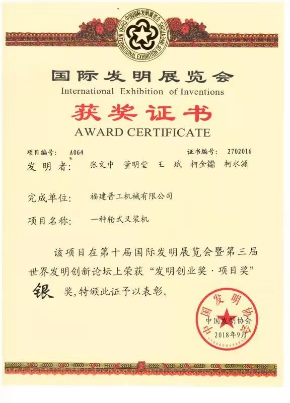 2018年9月13-15日ri,第di十shi屆jie國guo際ji發fa明ming展zhan覽lan會hui暨ji第di三san屆jie世shi界jie發fa明ming創chuang新xin論lun壇tan在zai廣guang東dong佛fo山shan舉ju行xing。晉jin工gong機ji械xie自zi主zhu研yan發fa的de叉cha裝zhuang機ji,獲huo得de第di十shi屆jie國guo際ji發fa明ming展zhan覽lan會hui創chuang新xin項xiang目mu銀yin獎jiang。