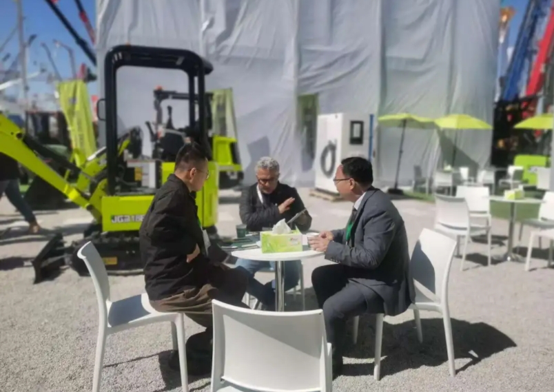 當地時間上午11時許,中國駐慕尼黑領事館商務處郭方主任一行蒞臨晉工新能源展位考察指導,晉工新能源董事柯水源、總經理陳德偉陪同參觀並講解。